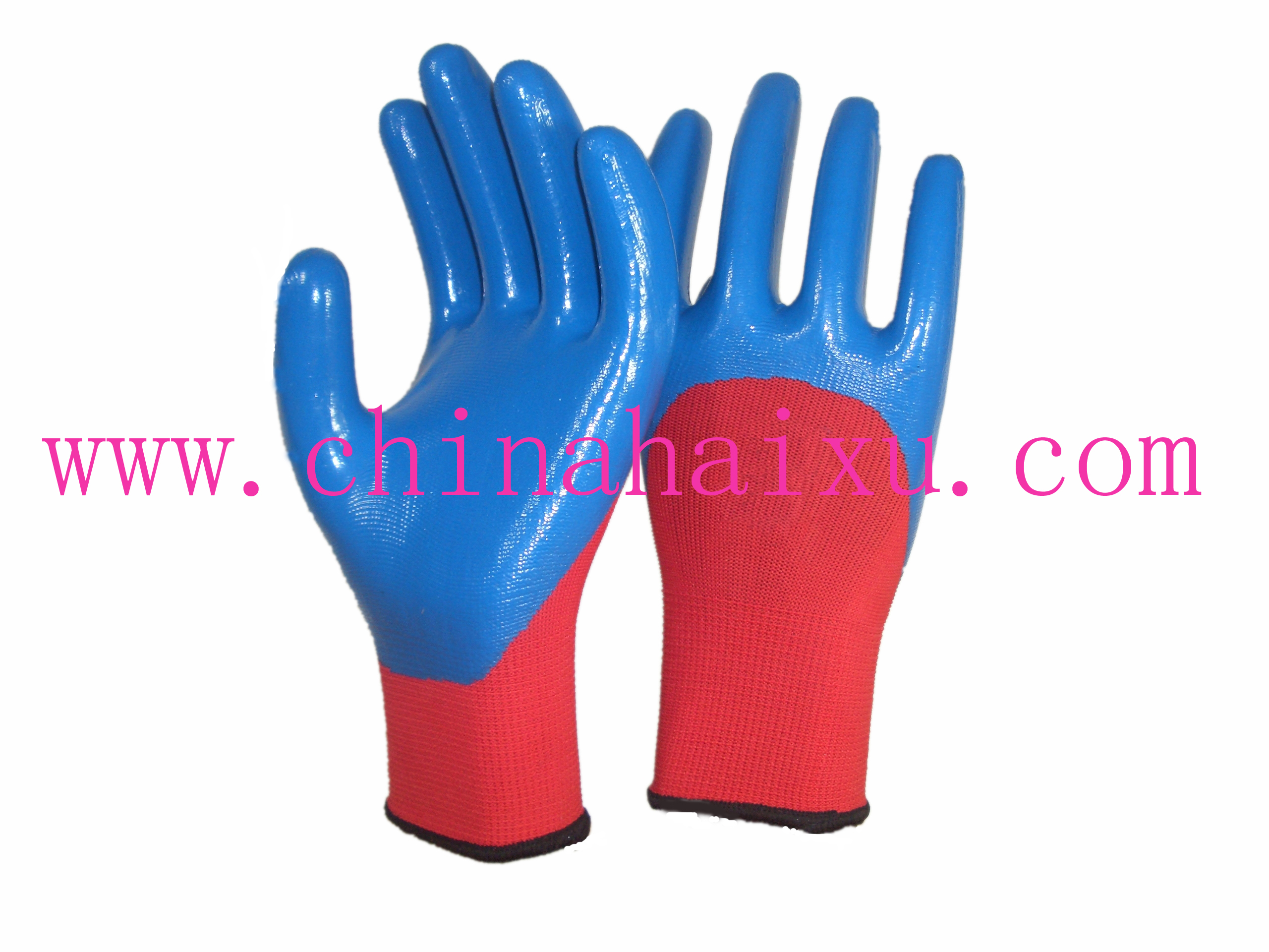 1. 13-gauge red polyester knit shell , Blue nitrile 3/4 coated, smooth finish.