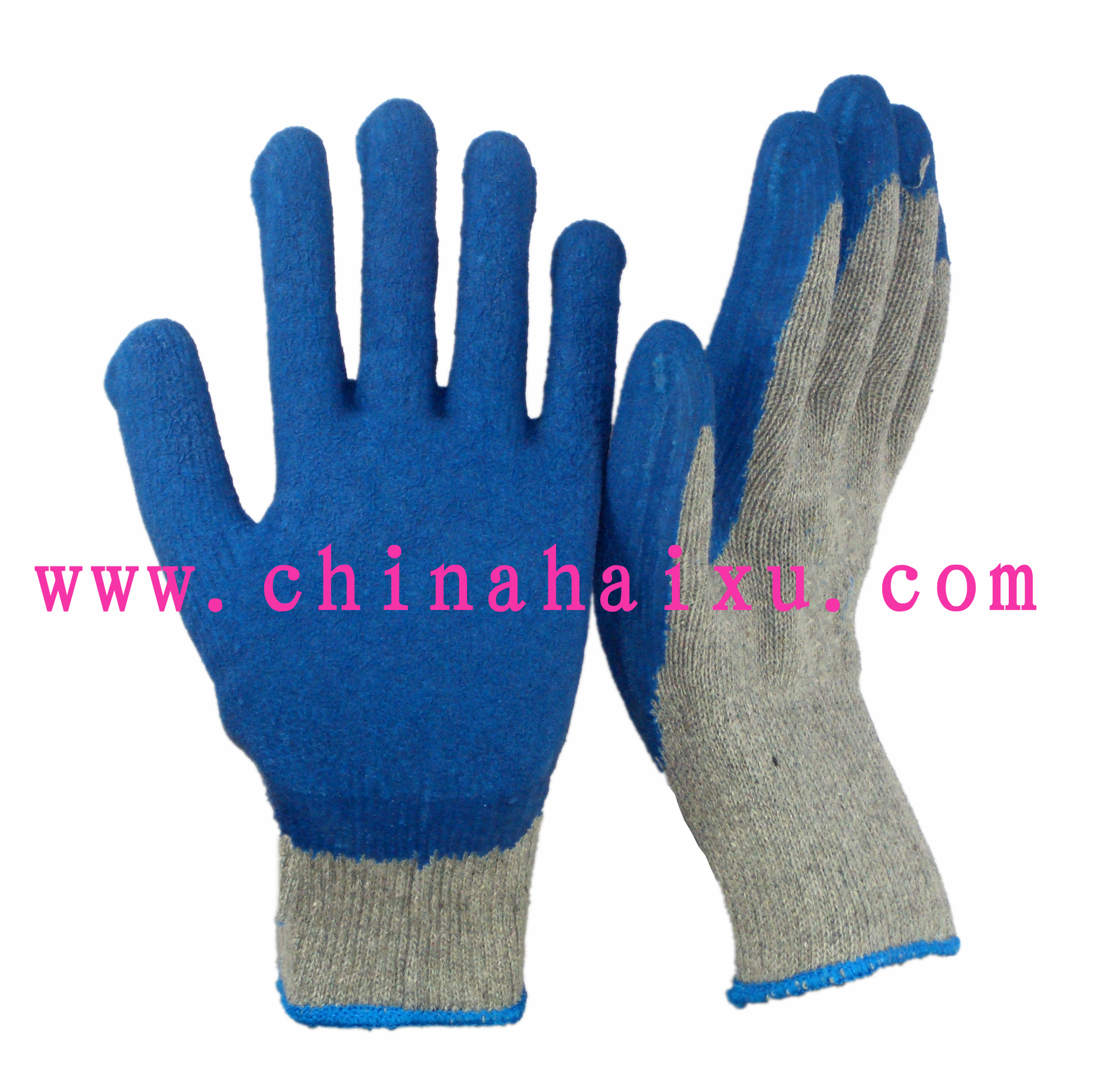 1. The glove lining was made by 10s grey roving shell,Blue natural latex palm and fingertip coated, crinkle finished.